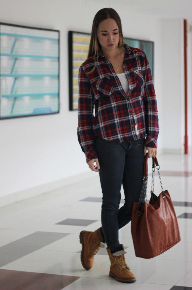We begin, of course, with the option with jeans. They fit brown berets, ankle boots or shoes on the platform. White or checkered shirt (with elements of white). Of accessories - a brown bag and belt.