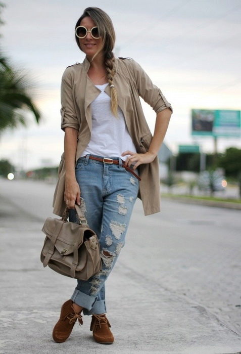 The next completely casual look: a beige trench coat, brown boots with a thick, massive heel and ripped jeans.