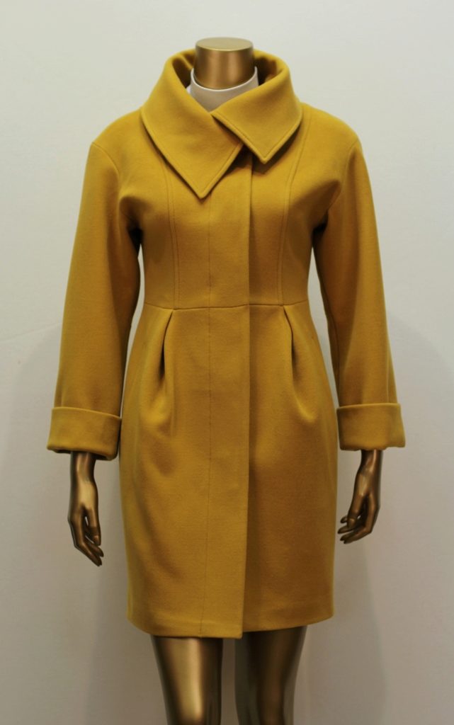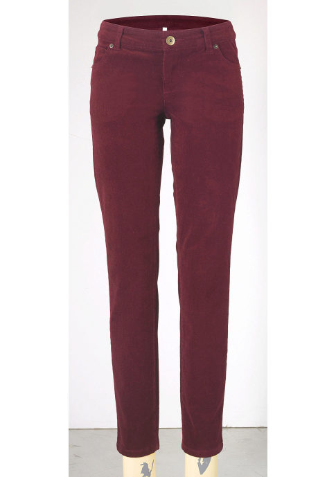 Burgundy corduroy pants, brown boots, mustard coat. Warm, cozy and stylish look for every day. Very feminine and elegant.