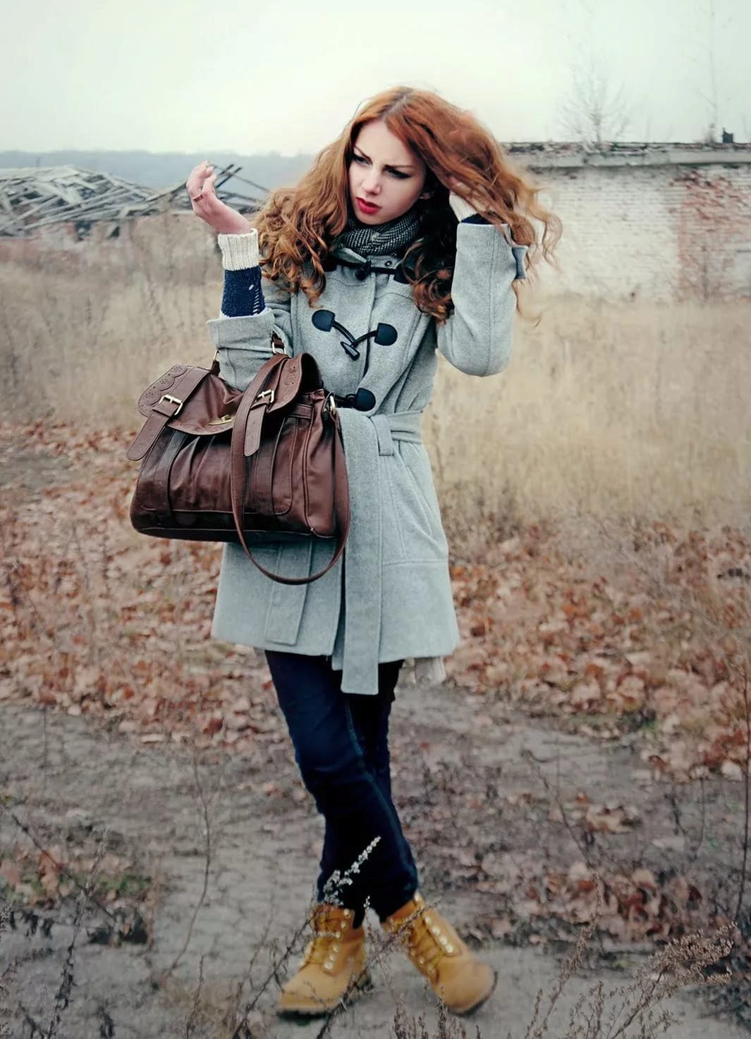 If you want to attract attention to yourself, the following image will help you with this. Emphasis on reddish-brown boots with bright enough colors. And to them clothing in monochrome tones. For example, in gray colors. And the bag also should not stand out, i.e. stay in gray colors. You definitely will not go unnoticed.