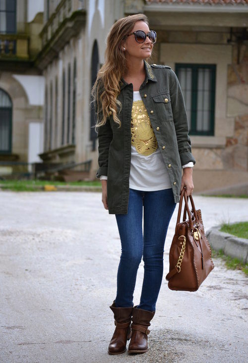 Military-style pants and dark brown brutal boots are ideal for creating an image of a confident, relaxed woman.