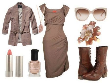 - A solid midi dress (for example, beige), brown boots and a belt or belt are also brown, but not in tone, but in other shades.