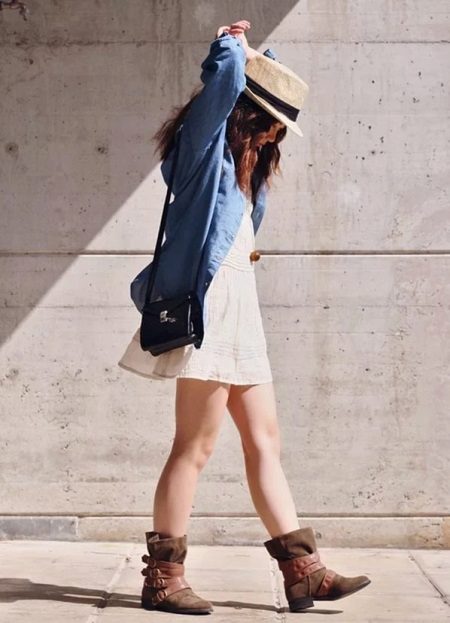Summer cool: brown lace-up boots and a wide mini dress. It can be colorful or monotonous. With long or short sleeves - to your taste.