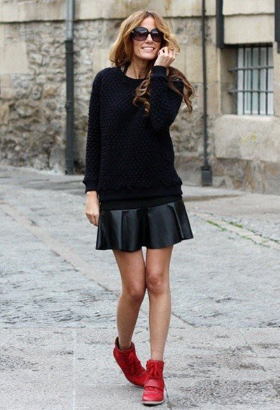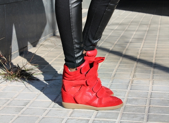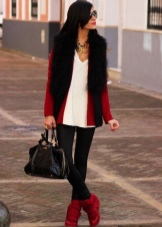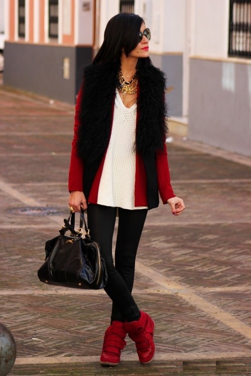 Sports chic on a popularity pedestal. Red shoes with a rich shade, with lacing, on a high platform in combination with jeans or warm leggings, will look amazing. To create a sporty look, red shoes with a hidden platform or a sole in contrasting white are suitable. Such winter couples will be perfectly combined, including with a ski or snowboard suit!