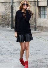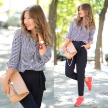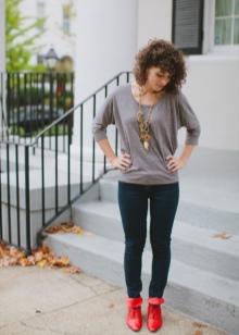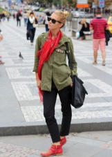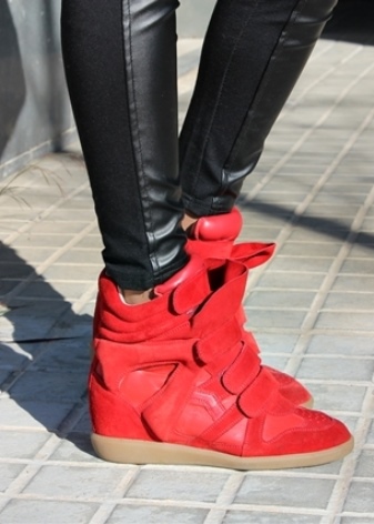 To create the effect of ease can serve as red shoes, very reminiscent of sneakers. These shoes are perfect fit sports cutotonovye breeches, made in beige tones. You can also wear a coat or a raincoat with them.