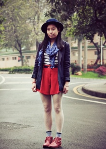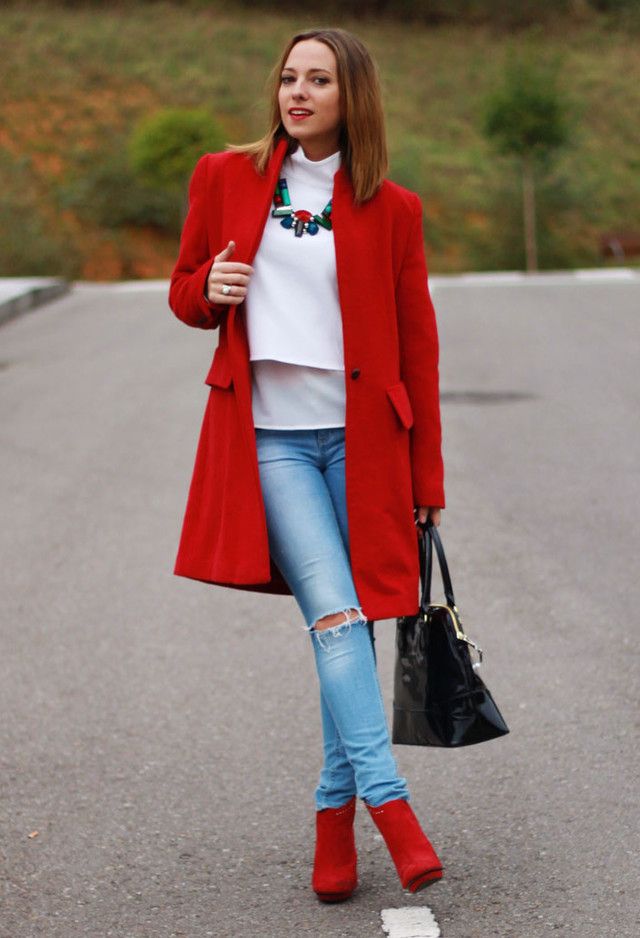 Not the best combination of red shoes with clothes made of light-colored jeans. Colored tights are not good for red shoes.