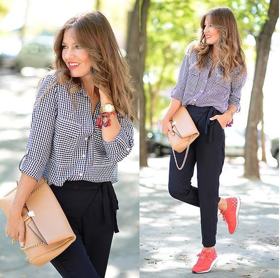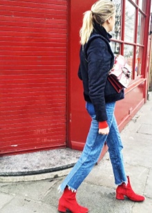 In a combination of blue clothes and red shoes there is one thing: a bust of contrasting shades can overload the image. Therefore, care must be taken here: everything is good in moderation.