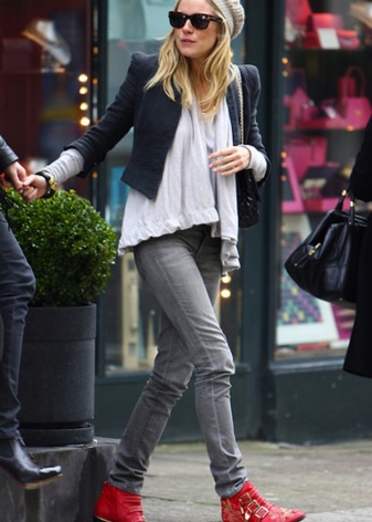 When selecting clothes, you can do the following: focus only on the shoe or pick up accessories to it. Definitely no need to use things of purple, blue, greenish colors. In addition, you should abandon all sorts of pastel colors.