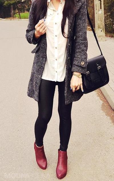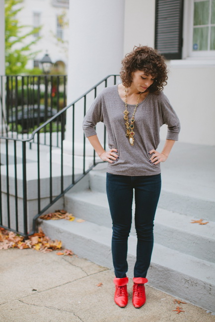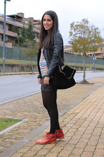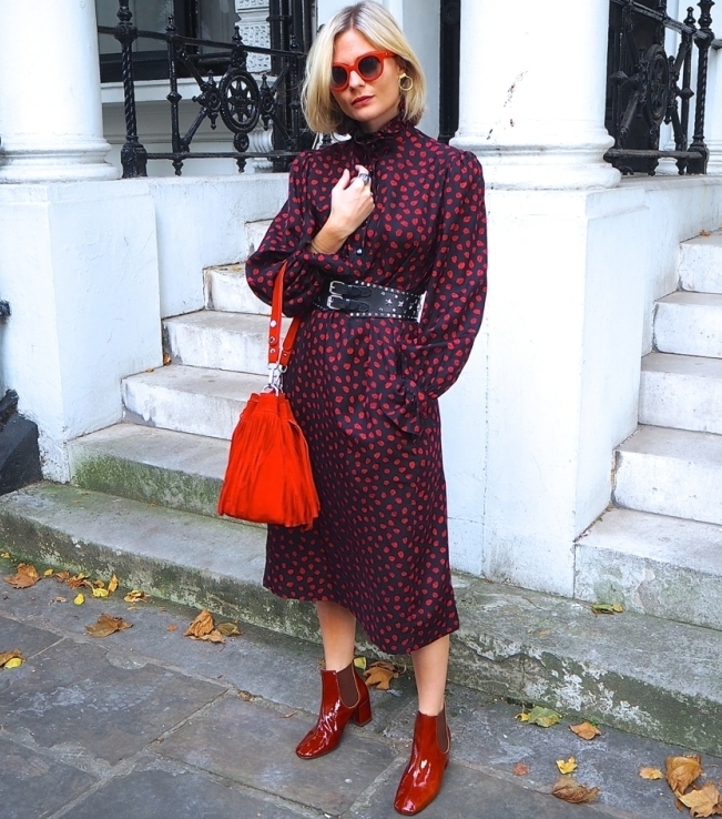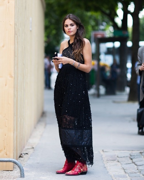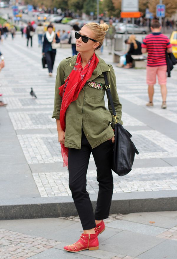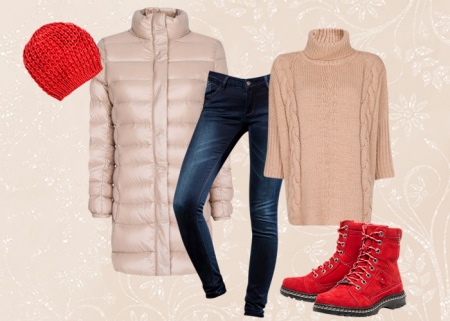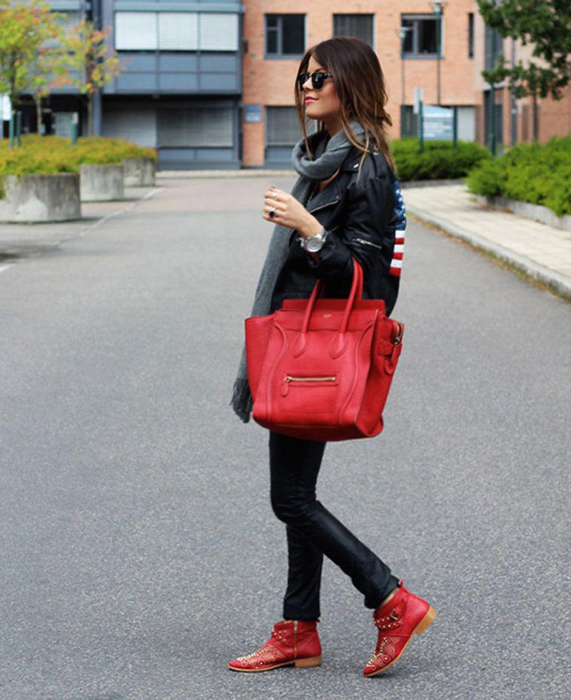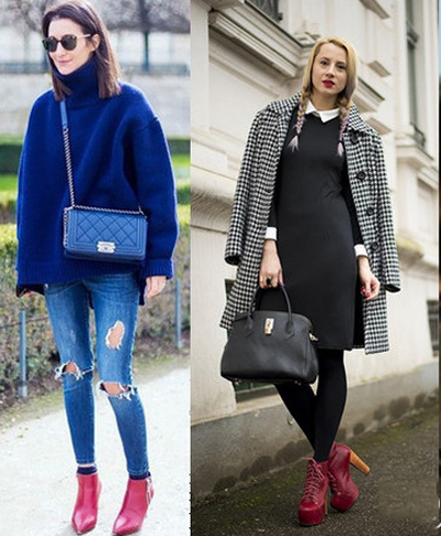 Beige things go perfectly with the red boot - they will dim the brightness of red and allow you to achieve the most soft image.