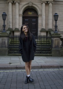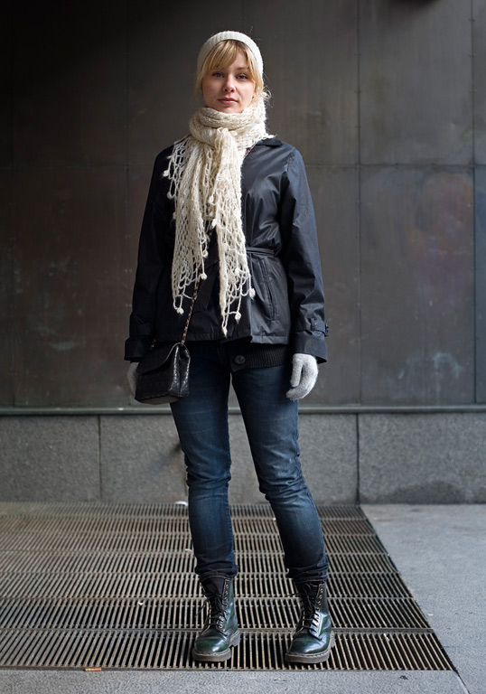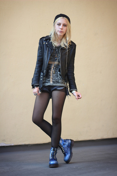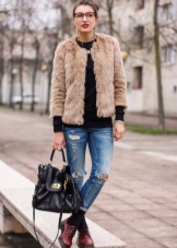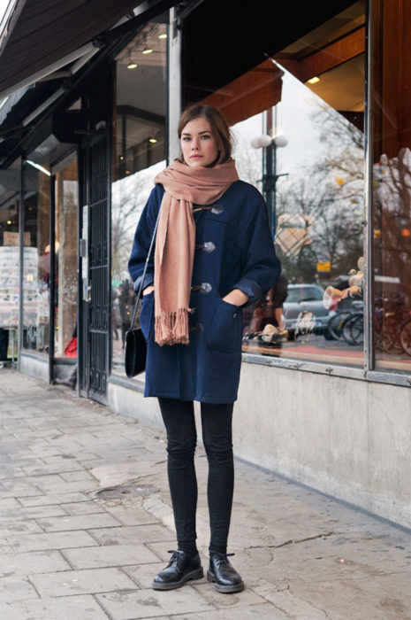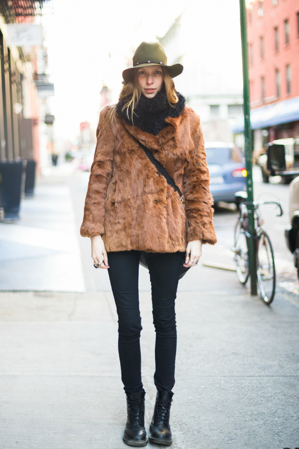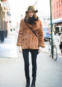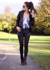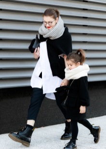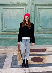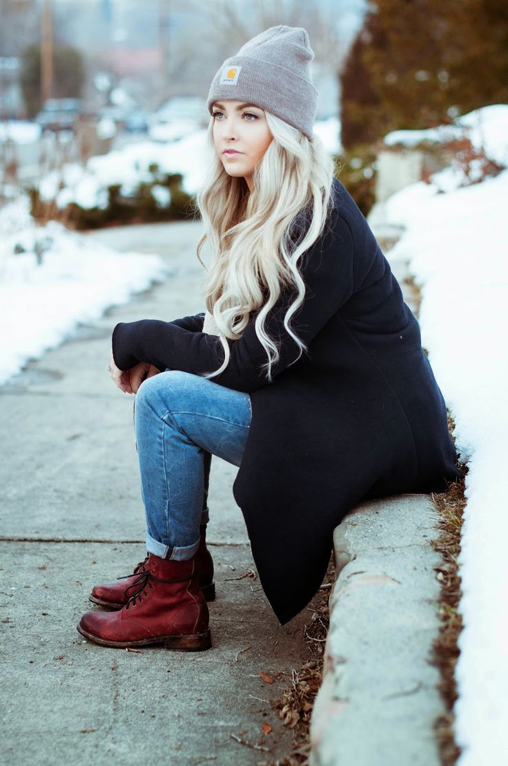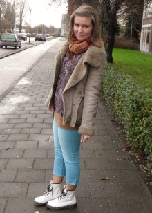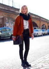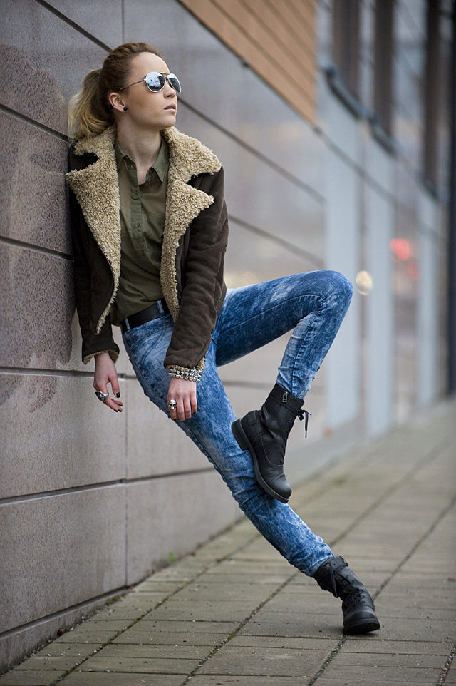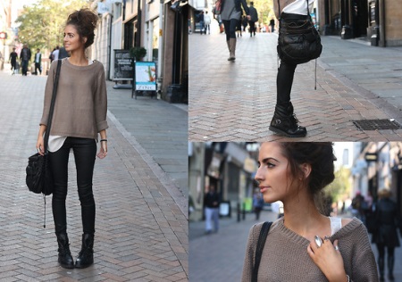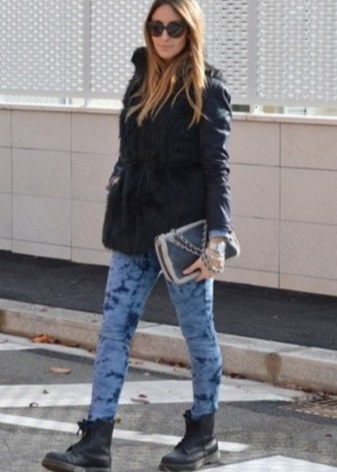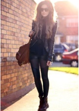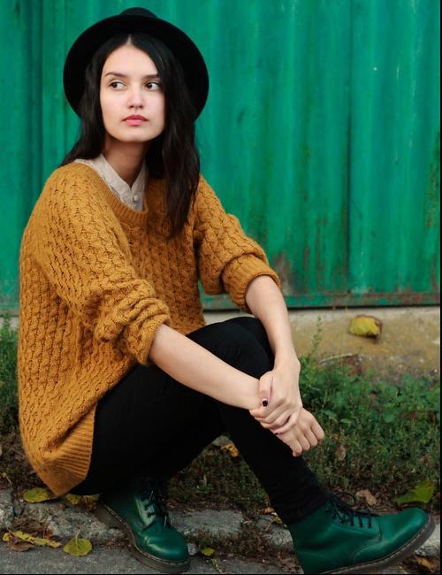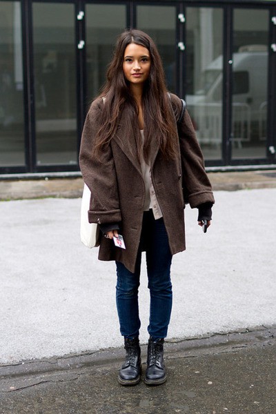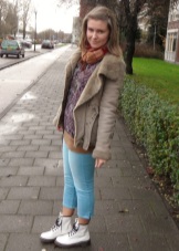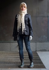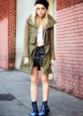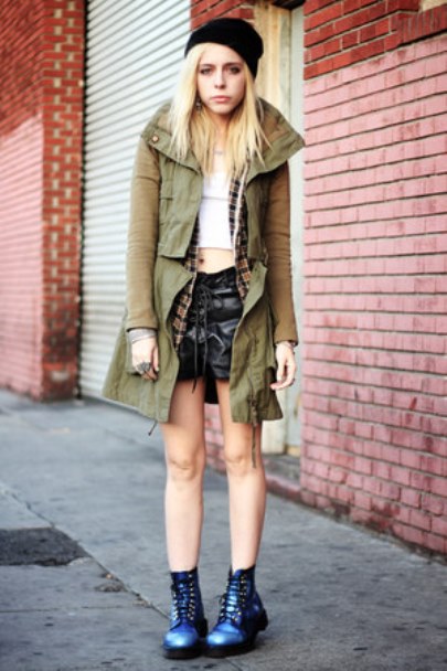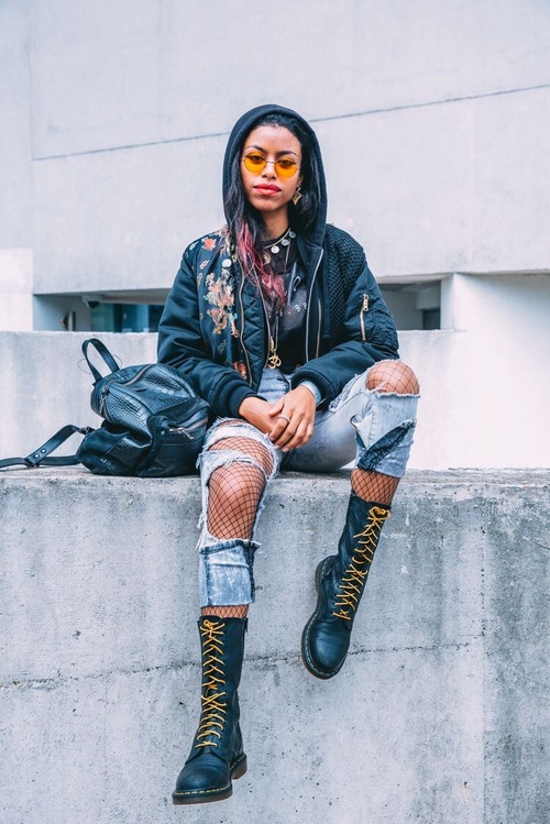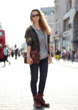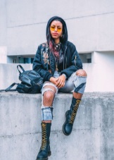 If you want aggressiveness in the image, black color and clothes made of leather, camouflage and thick denim will help to show it. For example, in the winter, martinses, blue jeans, a gray sweatshirt and a khaki-colored park will be perfectly combined;