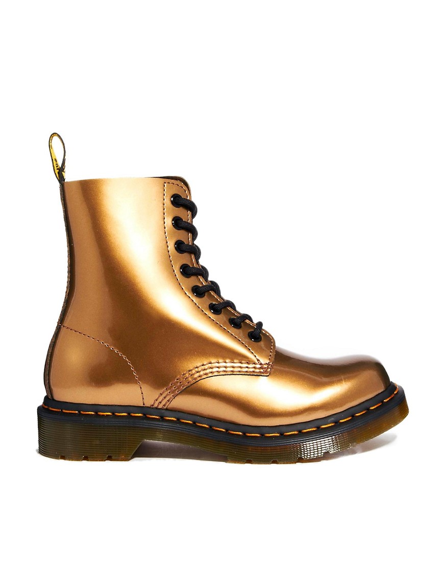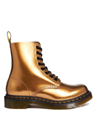 In the current season, metallic leather boots are at the peak of popularity, because this is a real trend of the season. Silvery, golden, crimson and blue - brilliant berets Dr. Martens will be a real highlight of your image.