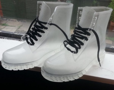 Transparent berets are made from vulcanized rubber and provide them with a classic anti-slip sole. Kinda, these are rubber boots, only laces. They can be colorless, colored and with various prints. Look great with bright socks and cropped jeans.