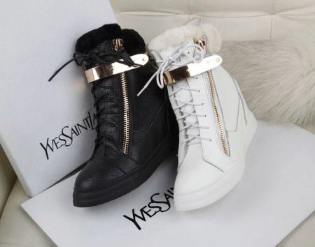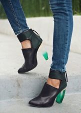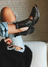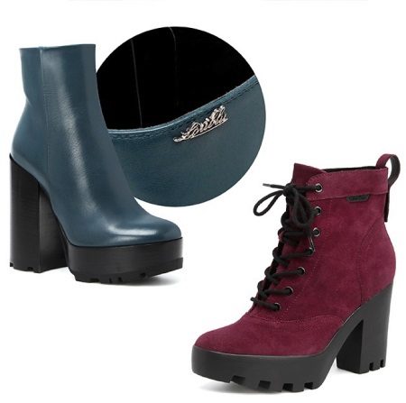 Can be presented in heels and on a flat sole. For lovers of an active lifestyle, it is preferable to choose the second option. For the evening exit shoes with heels fit the best. They are not deprived of decor and will look elegant. It is, rather, not even shoes, but half boots, where the zipper is a peculiar highlight.