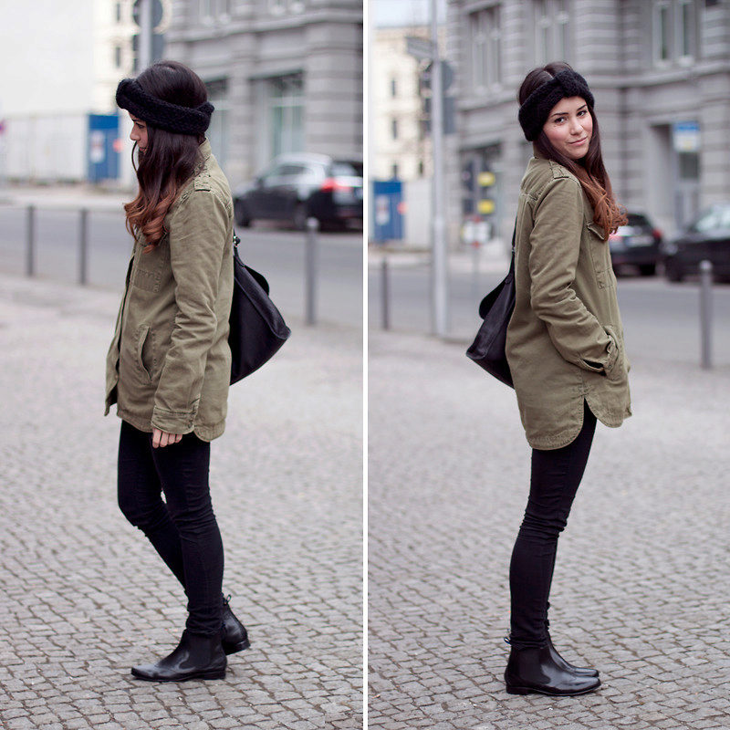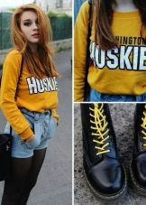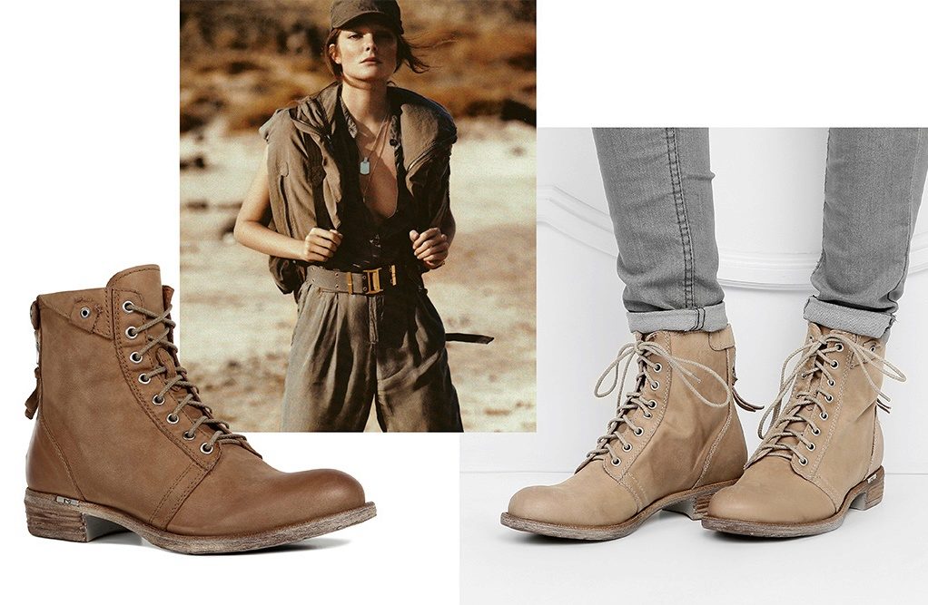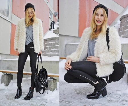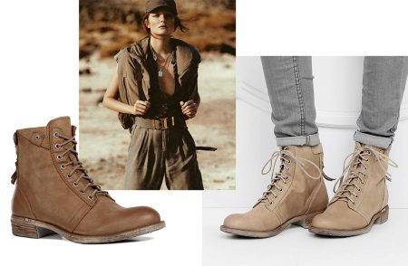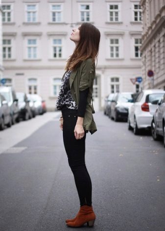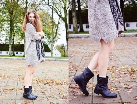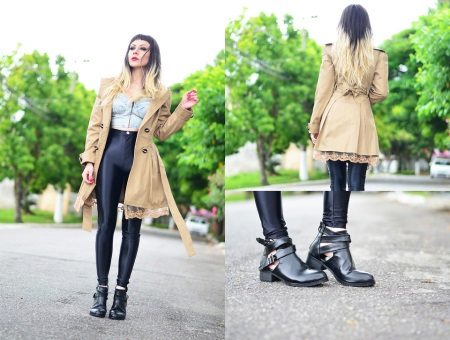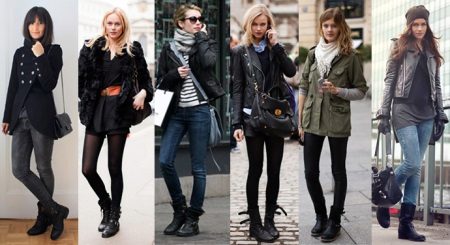 Boots in military style perfectly harmonize with both fitted and loose clothing. It is appropriate to wear leggings and skinny jeans, complete with a spacious top. Sweaters, voluminous T-shirts and turtlenecks will look great, as well as tight.