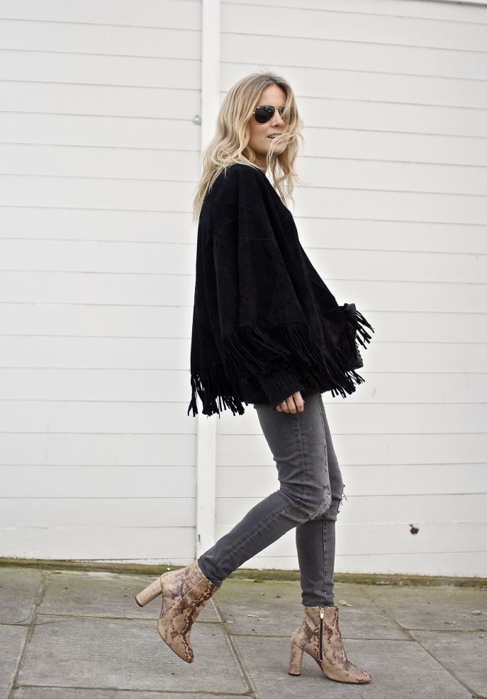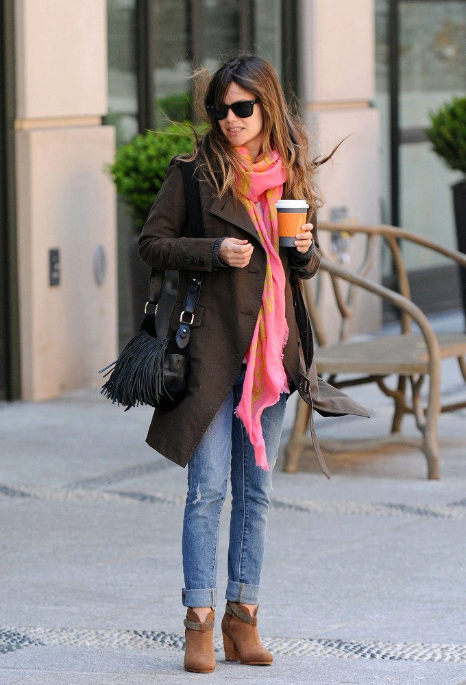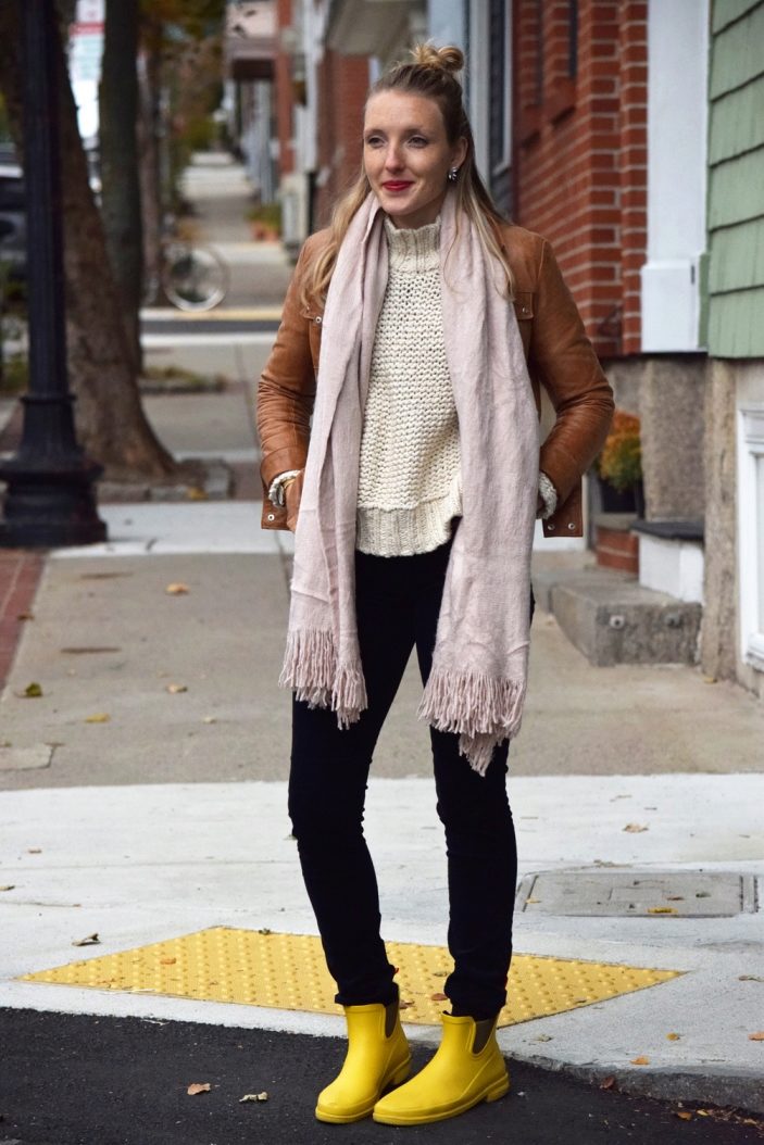 Another great "walking option" is a chelsea with narrow jeans tucked in and fitted top. The light leather jacket and bright accessory create a very interesting look.