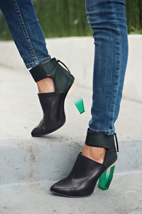 Orange shoes have always been and will be stylish and beautiful. There are a lot of styles of such shoes, and all of them are in perfect harmony with the blue top. And the newest and most unusual trend is a transparent heel. Shoes with a similar heel looks very original, since at first glance it is not noticeable. The best colors for shoes with this are black, red, dark blue, deep green.