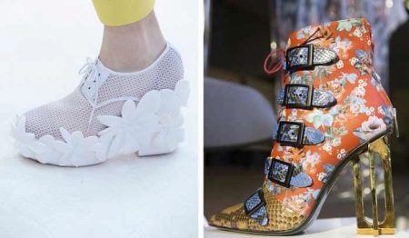 Designer fans also come to the rescue of extraordinary style, given the most unusual desires. Fashion for extravagant heels and platforms is an integral part of the season of 2017. These can be narrow heels at the top, and wide, triangular at the bottom, with a slope to the sole. Balenciaga, Marni, Givenchy, Versace are the main fashion houses that add such elements to their shoe collections.