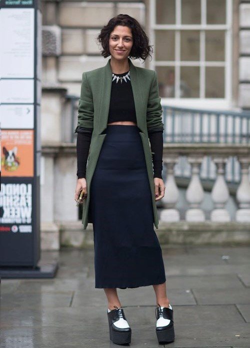 When combining women's shoes with thick soles and skirts, one should adhere to not only one's own preferences in length, material and model. Particular attention should be paid to the proportions and ratios of the length of the skirt, the height of the shoes and the "quality" of your legs. Here, as in the situation with shorts, a variety of tights, knee-highs and leggings fit very well under a crisp mini.