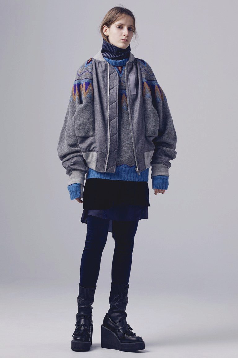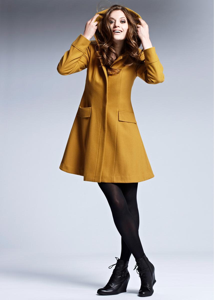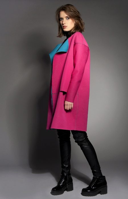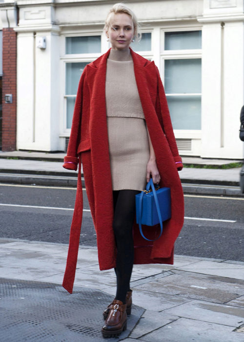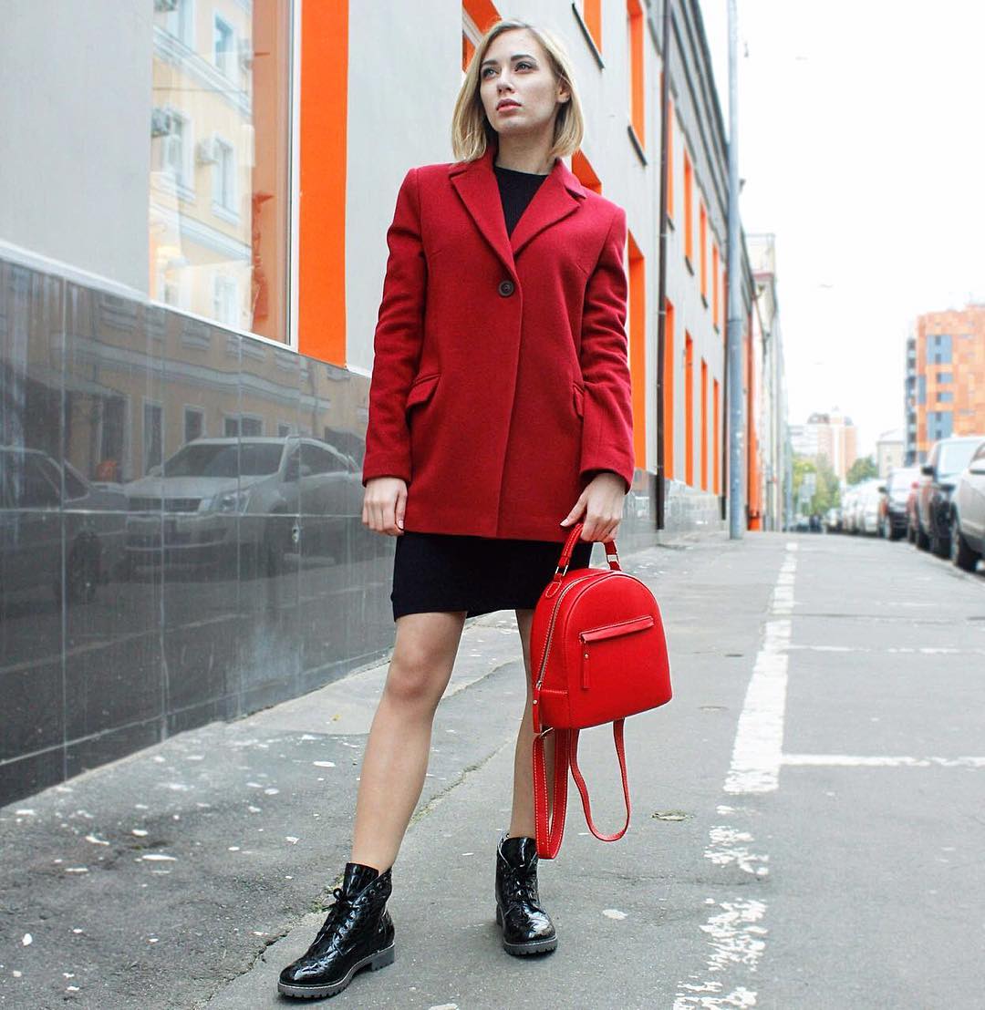 Bright, stylish, in trend. The three most important words about this image, which express the whole range of feelings and emotions. Red elongated jacket and red suede wedge shoes - looks original, but not shocking. Squatted black knee socks add romance and everyday life to the image.