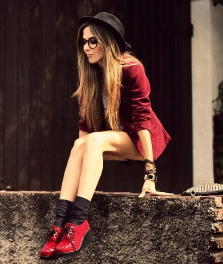 It all depends on what kind of shoes you want to see on yourself. If it comes to shoes that are closest to the classics, for example, oxfords, then patent leather and leather shoes will be appropriate here. But the image must necessarily be supplemented by various locks, laces, perhaps metal bling.