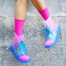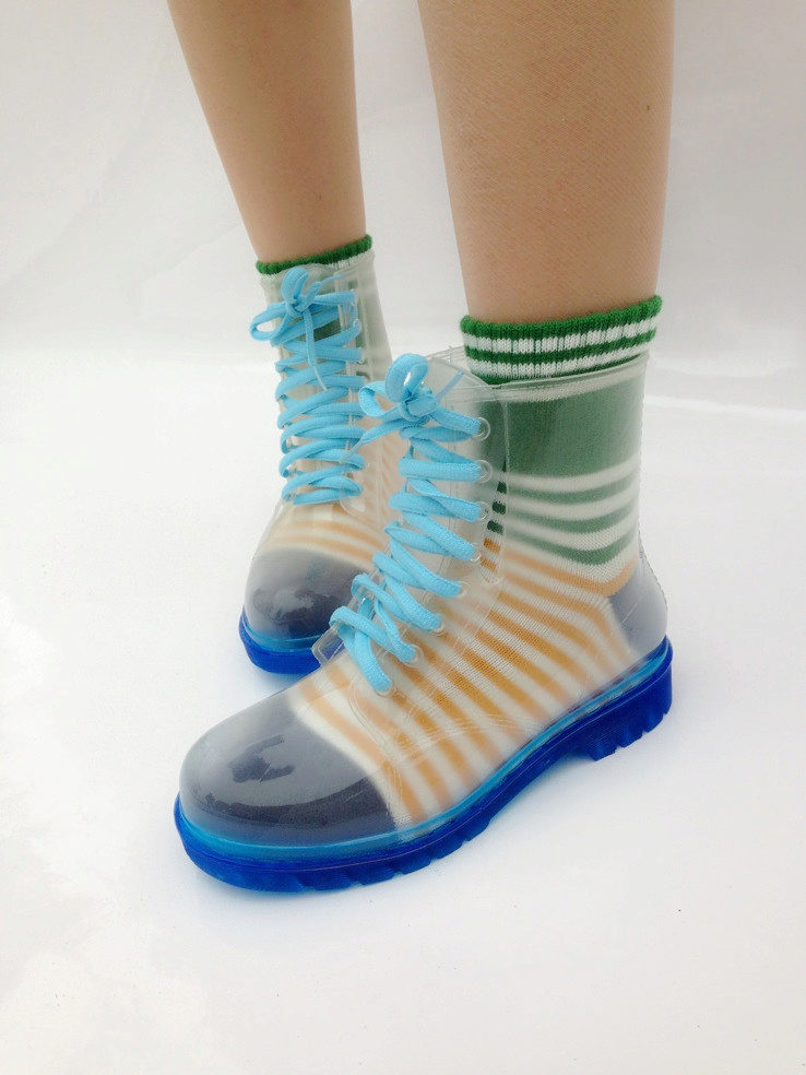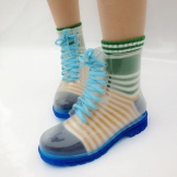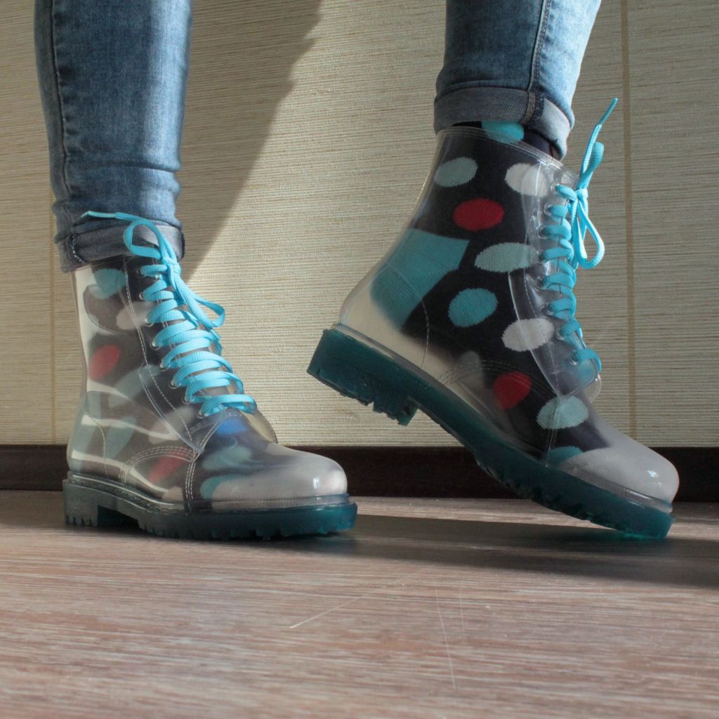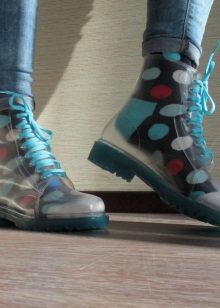 Transparent rubber boots not only protect the feet from the weather. They also act as a bright decorative element. Usually, bright socks or socks are worn under this shoe, which makes the image stylish, effective and original.