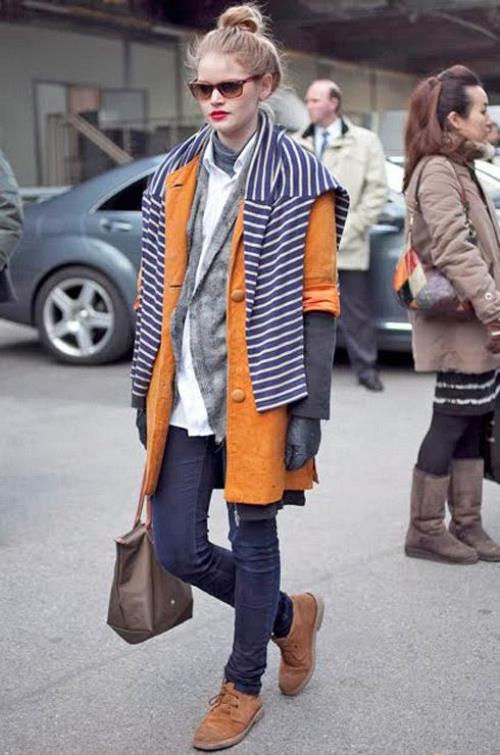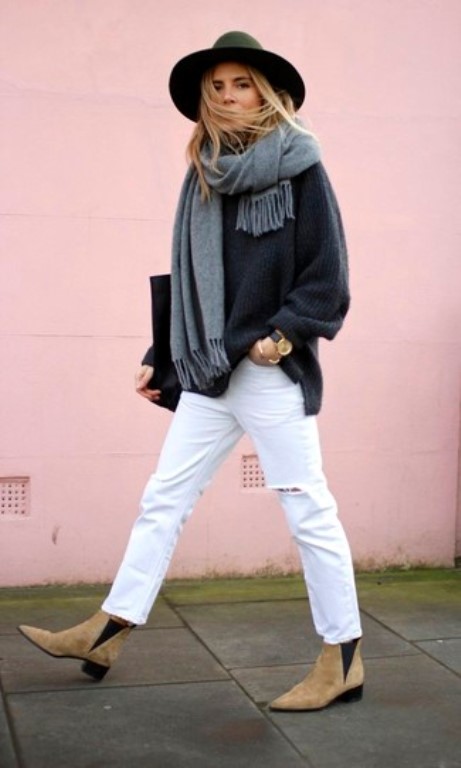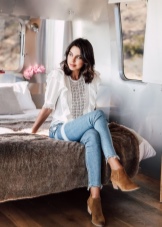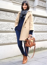 A combination of a cream jacket, skinny jeans and a trench coat will look feminine and elegant. You can easily create a romantic image with a gray straight coat and charming heeled shoes.