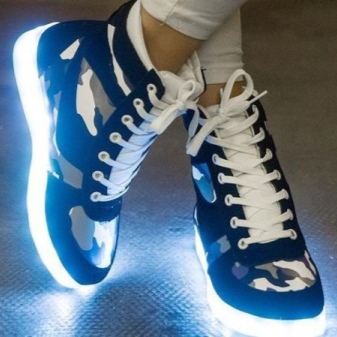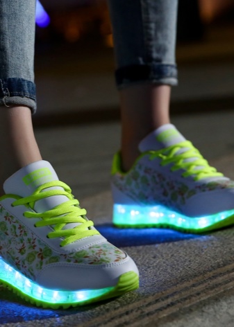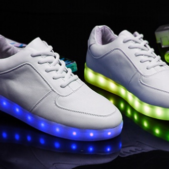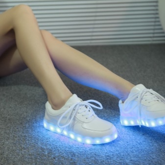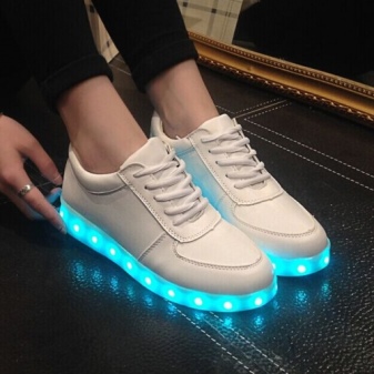 Shoes with glowing soles can have a very different design. As a rule, these are sports models with a flat sole or on a small wedge. These shoes fit perfectly in everyday wardrobe. They can wear a party, a morning jog, a walk with friends.