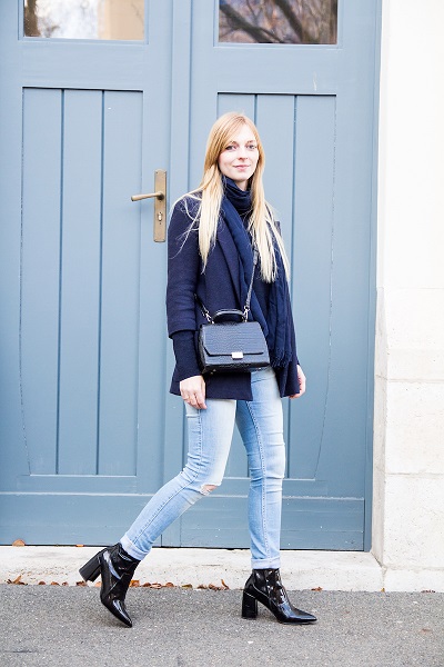 Blue lacquered shoes with a lacquered clutch, complemented by jeans, a blouse or a sweater, will become a fashionable accent of your look.