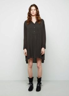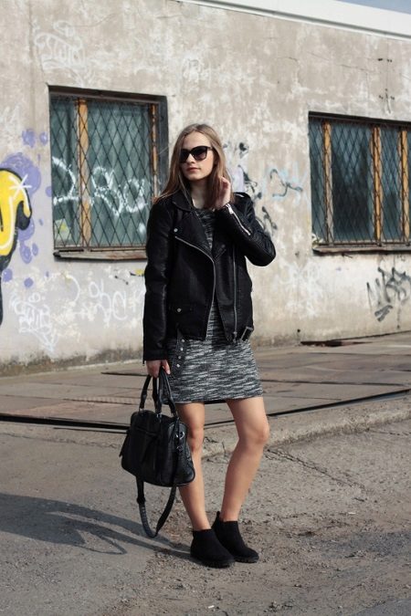 A little more, and this outfit can be called a black total look, which is not allowed by designers. However, the gray dress comes to the rescue. It perfectly dilutes the black elements of clothing, while keeping the entire style solid and complete. The dress is perfect for exploring the city, you can go to school and then immediately go to a party. Its zest is versatility.