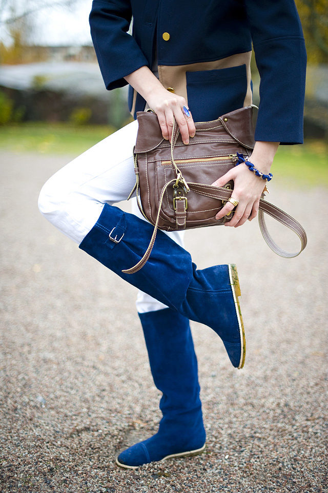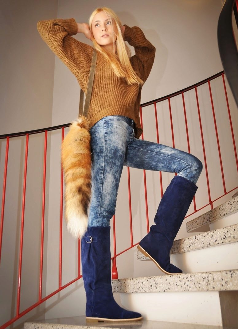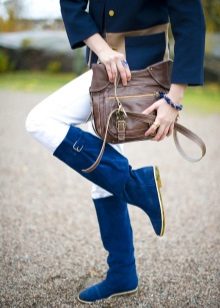 - Blue suede has long been at the height of fashion. Any shades are allowed, from light cold to deep warm. They are suitable for creating strict bows for office work. Other suede boots, sheath dress - the image of a business lady is ready.