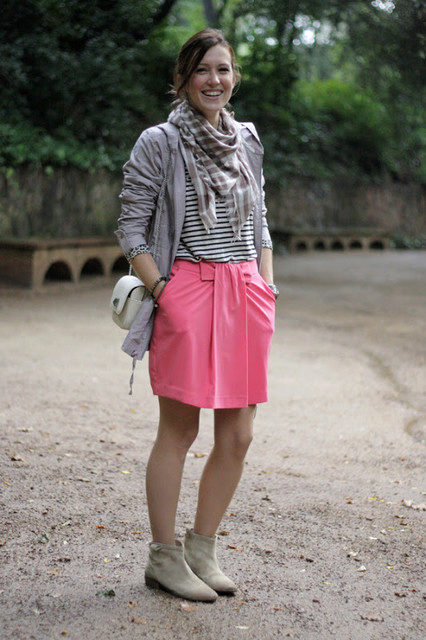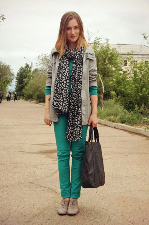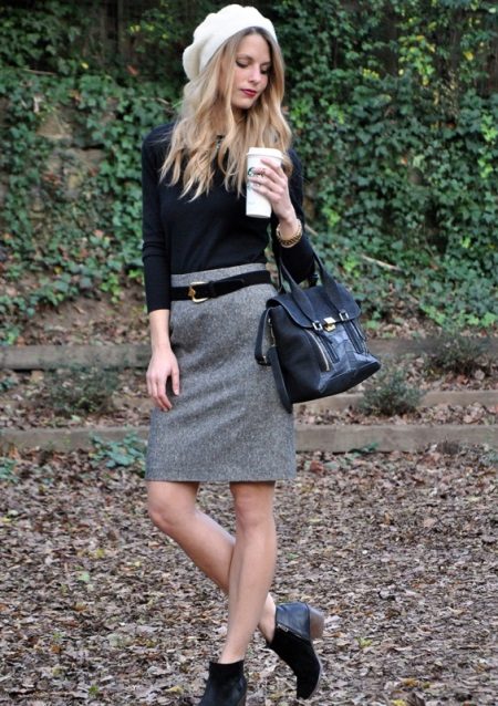 Great office bow - turtleneck, gray skirt, black suede shoes. It looks not boring at all, but refined and elegant. It is possible to dilute classical tones with the help of bright accessories - a scarf, ornaments.