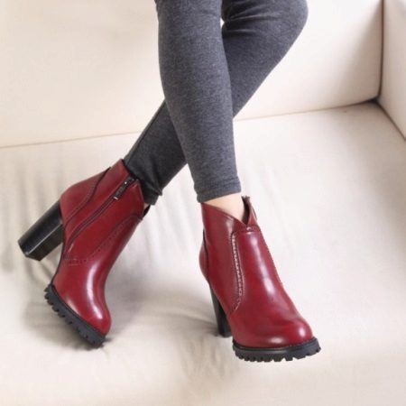 Burgundy low shoes with a steady high heel will become the center of the whole image. They are difficult not to notice, the noble color, rich will find a combination with dark and light clothing. Low shoes can be successfully combined with pants, dresses, skirts, jeans.
