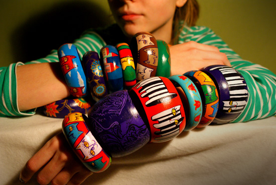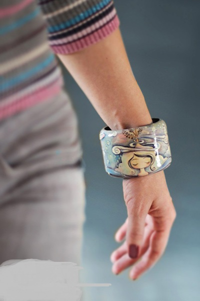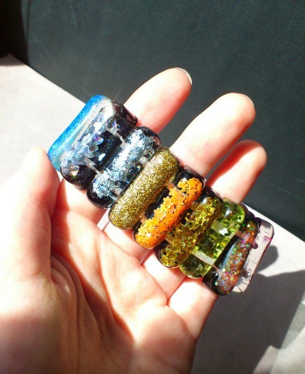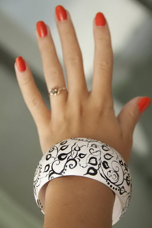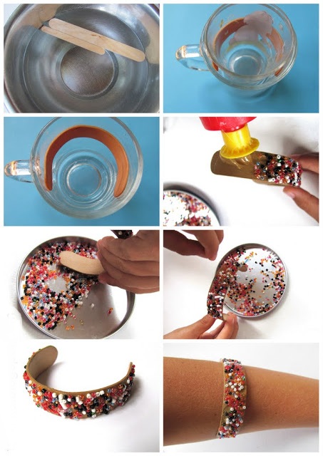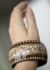 A unique decoration that you can create with your own hands. To do this, you need a wooden medical staple or a regular ice cream stick. The workpiece is soaked in water for a day so that it can be bent. Then placed inside the glass so that it acquired a rounded shape, and leave for a day. Then the most interesting begins - the endless possibilities for decorating the future fashion bracelet.