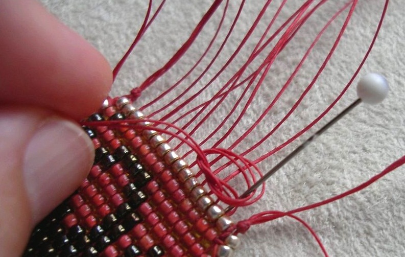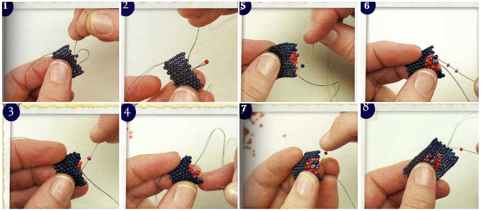 Thread the fishing line in the extreme row of blue and lead along, adding beads. This should be done every two beads in the woven section.