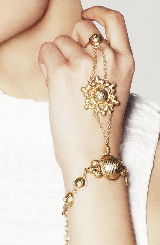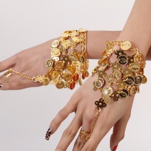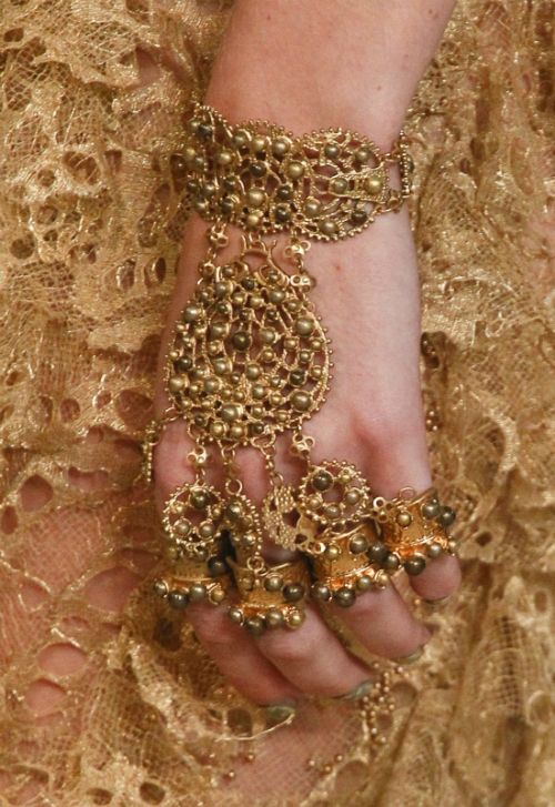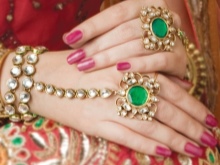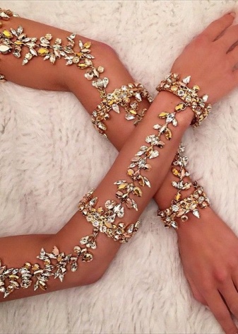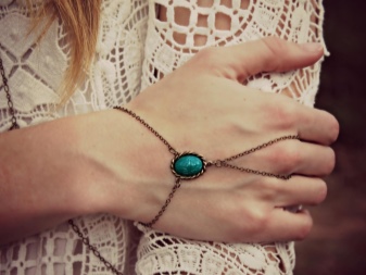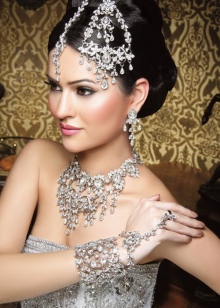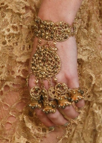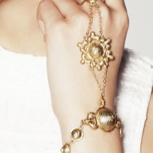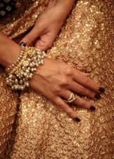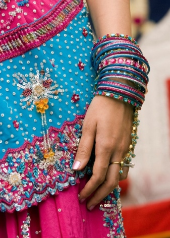 Indian-style jewelery is created according to local customs. For example, in some ethnic groups it is customary to wear bracelets, completely covering their hand from wrist to forearm. Another common option is a wrist band with a ring, when richly decorated threads are drawn from one hand to one or several fingers.