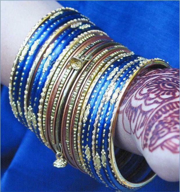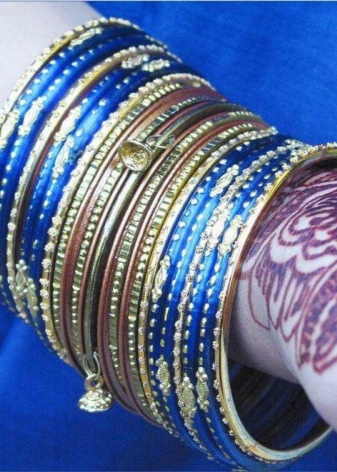 Wearing bracelets in India is not just a tribute to beauty and fashion trends, but also an integral part of a ritual, such as a wedding ritual. After the wedding, the woman committed to wear bracelets on her arm. But in this case, she was obliged to follow local customs. For some ethnic groups it was customary to combine gold and glass jewelry on hand.