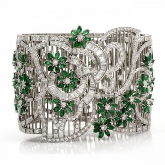 The gold bracelet with emerald stones is most suitable for women with light or red hair, green eyes and light skin tone (especially in combination with strict evening gowns and dark shades in clothing). Large gems reflect more light and attract glances with their brightness. You can add an image with earrings with emerald stones.