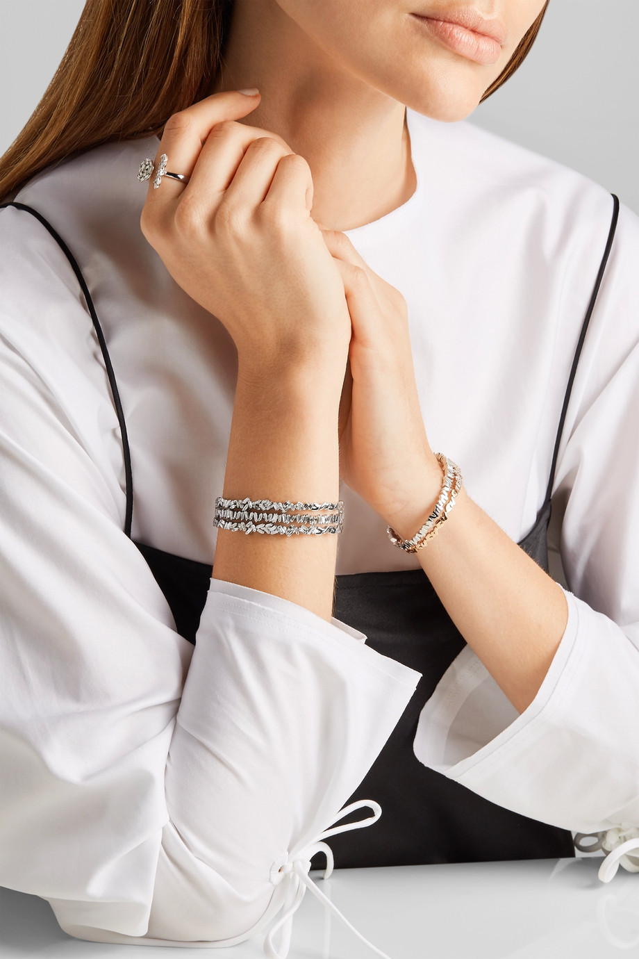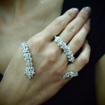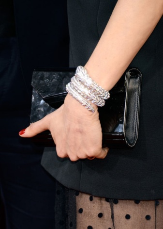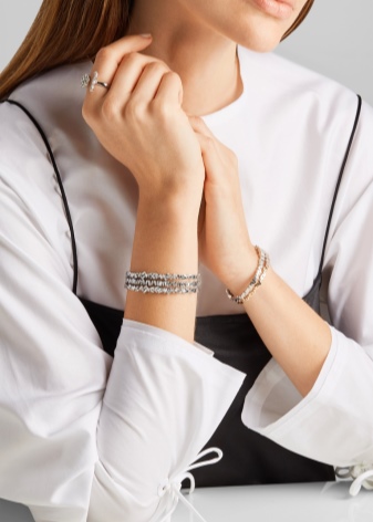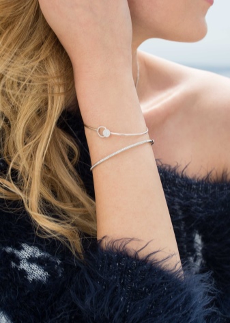 A thin bracelet made of white gold will emphasize the fragility of the girl's wrist, and also perfectly match with light clothing made of light fabrics or with laces. Typically, such jewelry is chosen in addition to the romantic images, light skin tones and light air hairstyles.