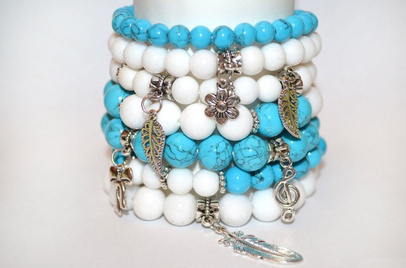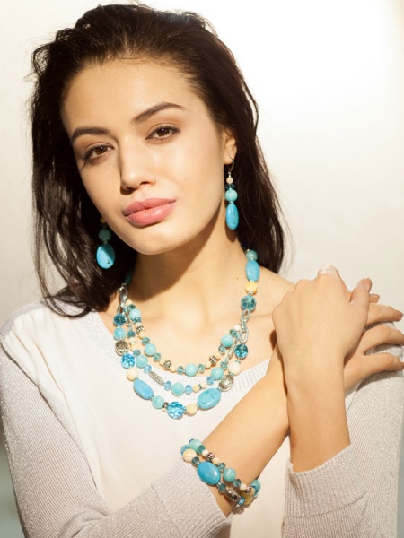 Stylish jewelry with beads and stones of different shades (blue, milk) will perfectly complement any casual outfit.