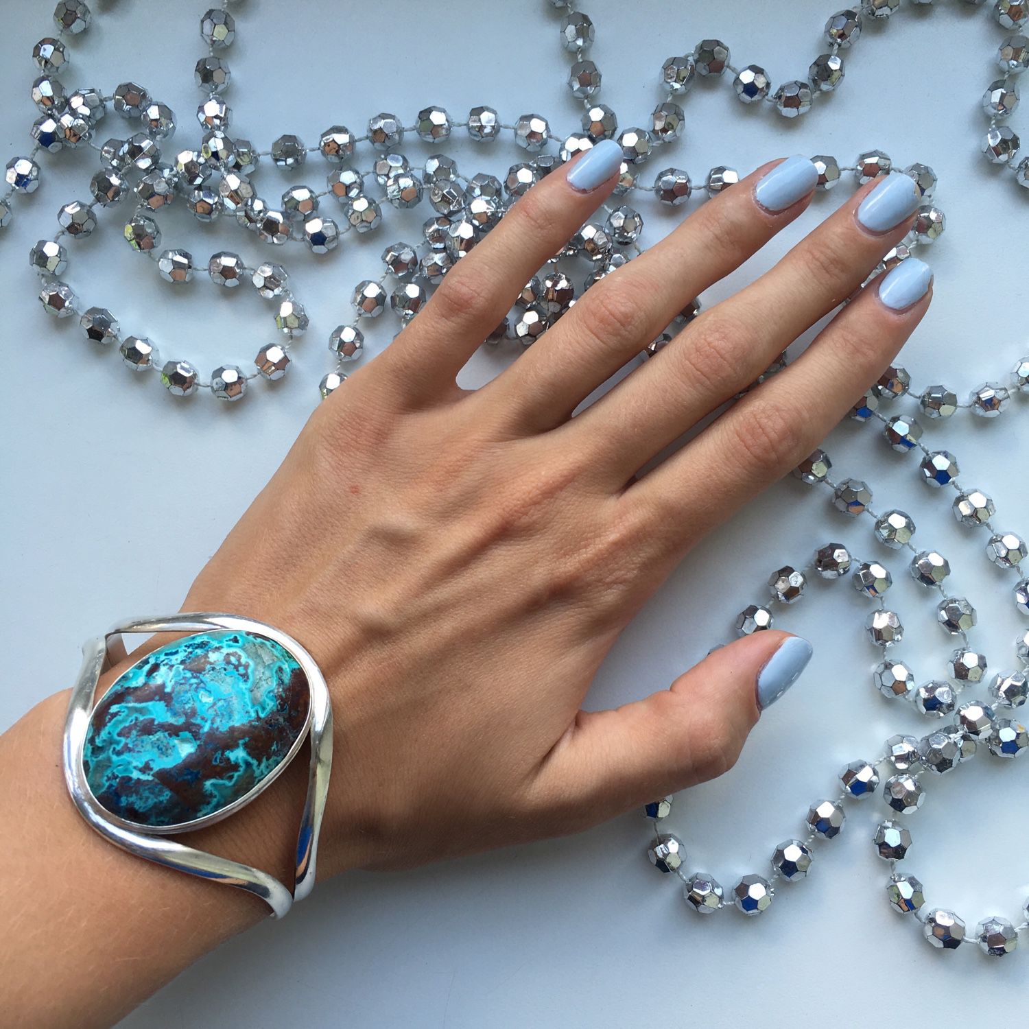The bracelet can be decorated with one large stone or a small scattering of small ones. In many cases, the product is made in the same color range, but multi-colored stones can easily alternate. Silver ornaments with transparent pale blue, pink, green stones look great.