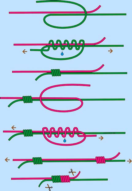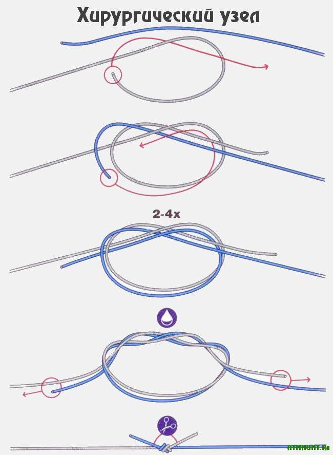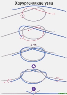 - Surgical - for a start, you need to make one so-called "semi-node". To create it, one end of the cord should be held with one hand and the other end rounded around the first. Then create another half node. To secure the cord twine twice in the first half, and once - in the second. After that, the ends of the cord should be cut off, leaving no more than one and a half centimeters.