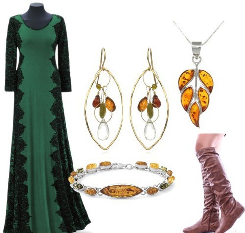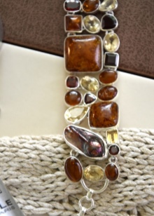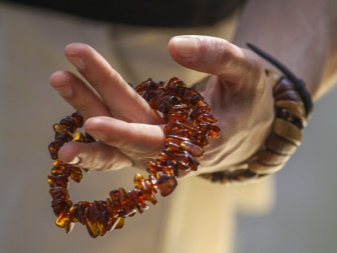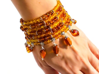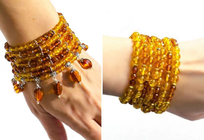 In the summer, you can wear a thin bracelet on your hand, because you really want the image to be light and fresh. Small compact products are recommended to be combined with a long light skirt, a flying sundress or a short dress. In winter, amber looks great on woolen clothes. Plain sweaters, woolen or knitted dresses are an excellent choice for wearing such jewelry. And for the appearance of wearing light wear amber, set in gold or platinum - such a product will make the image delicate and elegant.