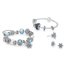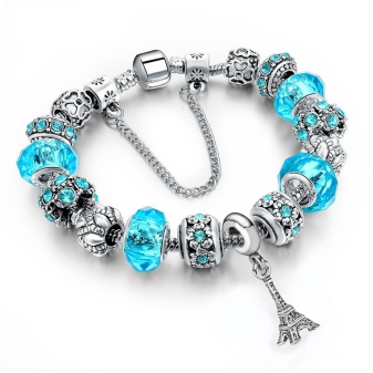 The combination of silver with blue glass and the same shade of stones looks interesting. The bracelet has a charm-pendant, beads with holes, separating elements. All together looks gentle and at ease. This jewelry will be a chic addition to the summer look, it is light and elegant.