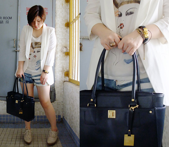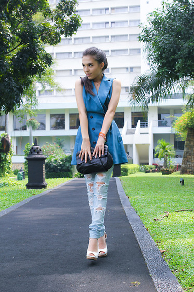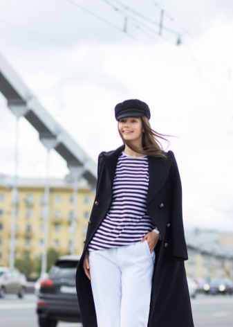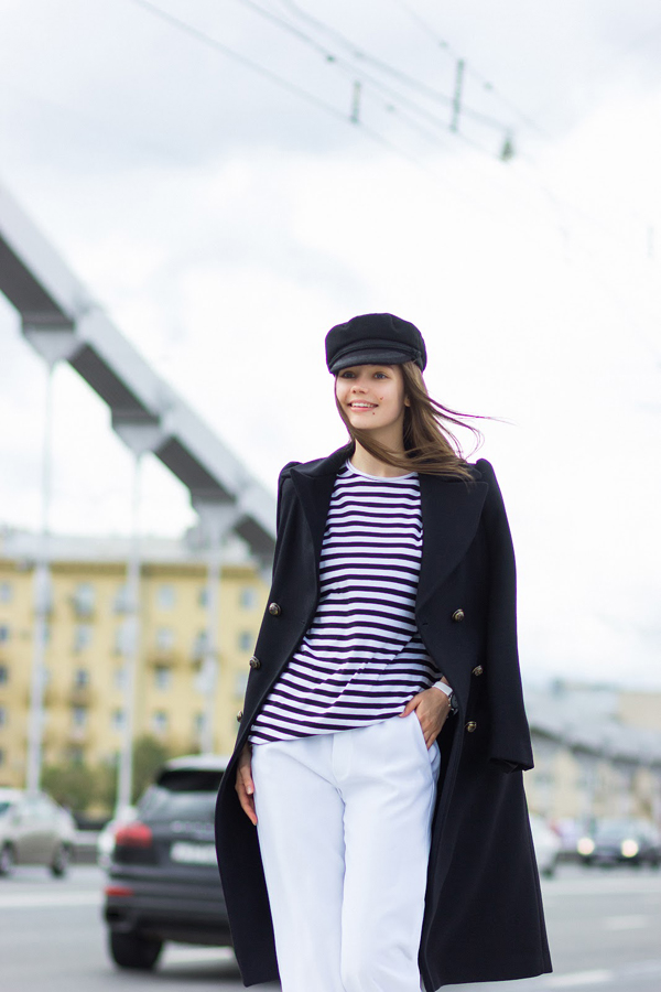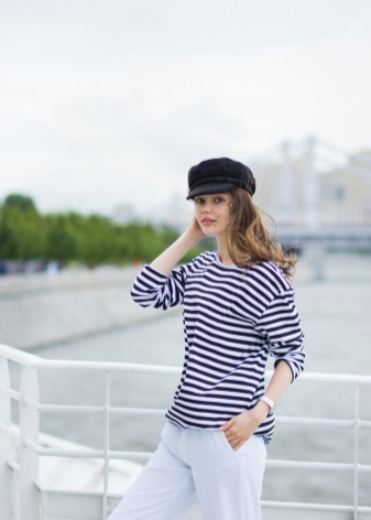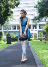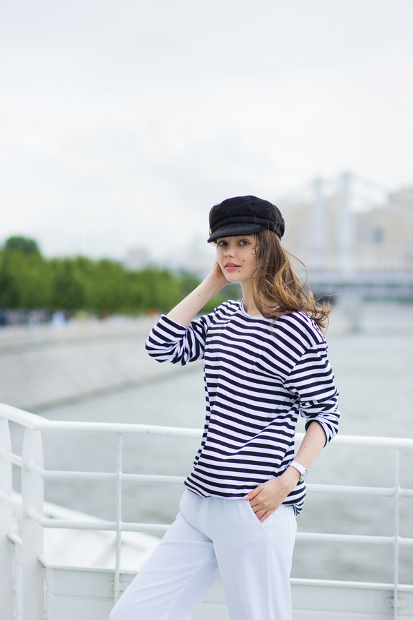Classic blue color is perfectly combined with different metal inserts or pendants in a marine theme. Striped top, beach denim shorts and clogs complete the summer marine look. Do not forget to put a hat in a suitcase, and now you are ready for a cruise or a long-awaited vacation!
