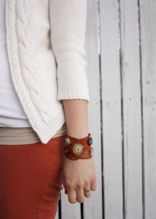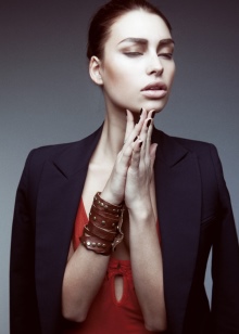 Before choosing a jewelery made from leather, pay attention to the features of the structure and shape of the hands. The thinner the wrist, the better the thick wide bracelets will look. The choice of color and decorative elements depends entirely on the image with which you are planning this decoration.