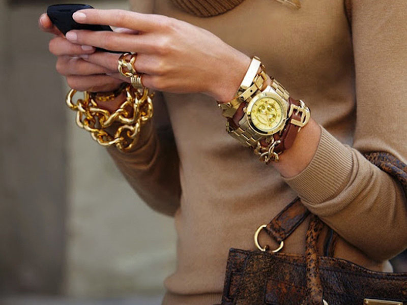 It all depends on your chosen style. If you like to wear a watch, then you need to pick up a tandem. In such cases, you should pay attention to the material of the watch strap and its color. If the watch is gold, then one or more thin bracelets with gold elements will look great. This will make a beautiful combination.