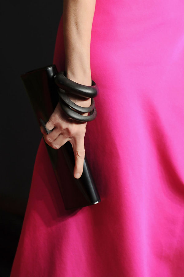 The combination with stones, gold, fur looks very expensive, dignified. A pair bracelet with amber is suitable for an evening look. An excellent option would be a dress - case and black clutch.