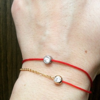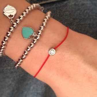 You can pay attention to the collection of famous brands. In the assortment of many companies you can find bracelets made of red thread, complemented by silver inlays, rhinestones, precious stones or amulets with diamonds.