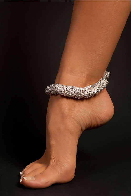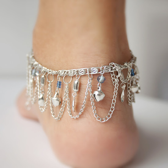 - If you are a happy owner of long and slender legs, then thin silver bracelets will look fabulous on you. They can be decorated with various elements of decor: charms or pendants.