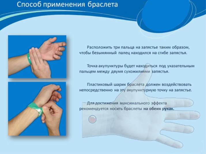 The peculiarity of the bracelet is the need for long wear during the trip. Despite the fact that this bracelet does not interfere with the process of wearing, in order to avoid relapse it is not recommended to take it off on the road. However, if the hand begins to sweat, edema appears associated with increased skin sensitivity with prolonged pressure of the ball at the desired point, the wristband should be removed.